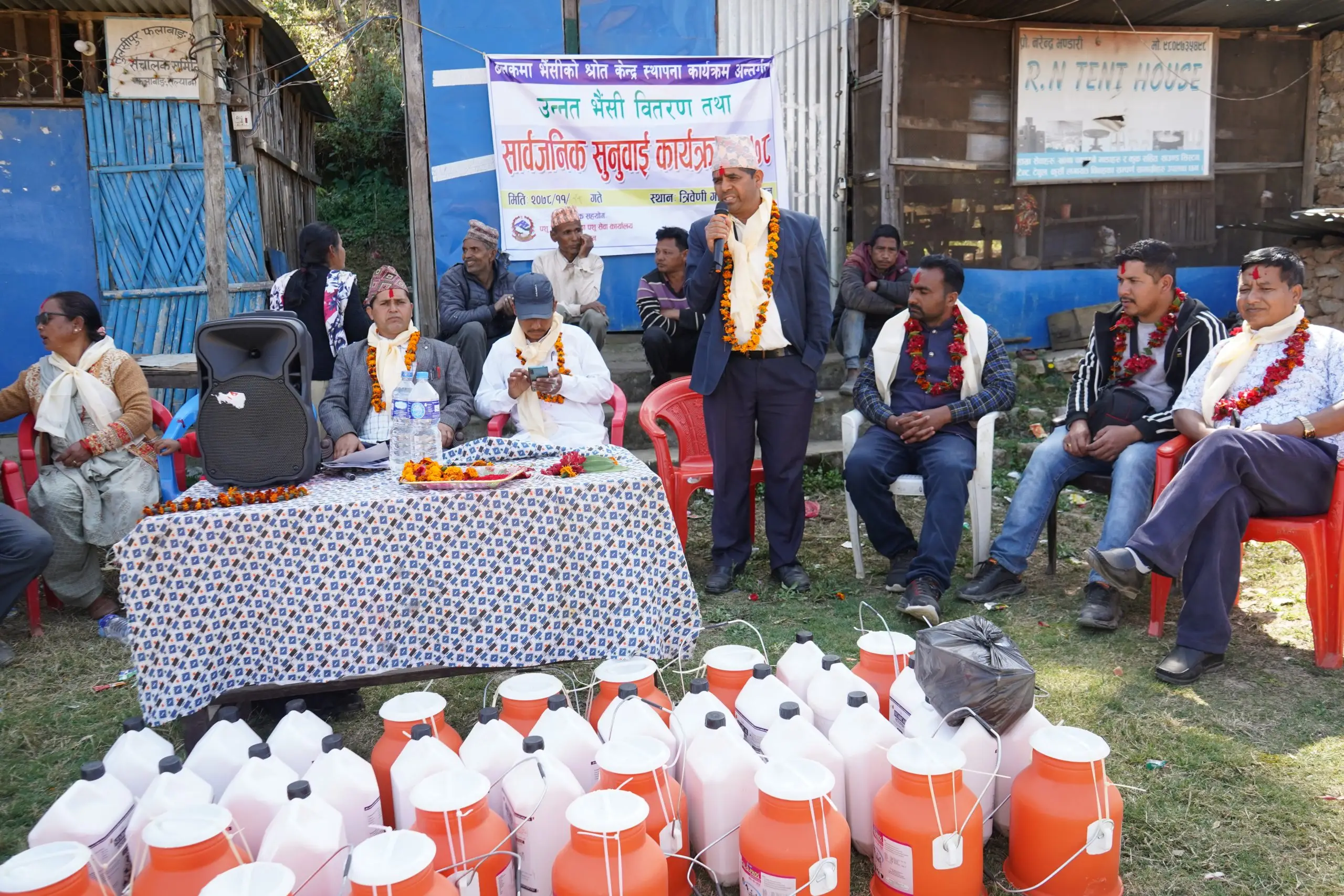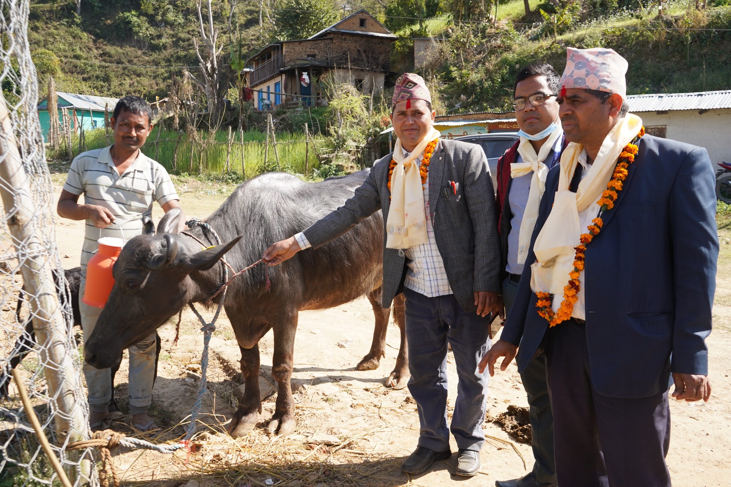 भैँसी र दूधमा जिल्लालाई आत्मनिर्भर बनाउँदै कृषकको आयआर्जनमा वृद्धि गर्ने उद्देश्यसहित ब्लकमा भैँसीको स्रोत केन्द्र स्थापना कार्यक्रम अन्र्तगत त्रिबेणी गाउँपालिका वडा नम्बर ४ फलाबाङमा रहेको थर्कोट भैँसीपालन कृषक समुहमा आवद्ध कृषकहरुलाई भैँसी खरिदका लागि अनुदान उपलव्ध गराइएको थियो । समुहका अध्यक्ष दिपक कुमार रेग्मीले समुह भित्र रहेका २० जना कृषकहरुलाई भैसी वितरण गरिएको बताउनुभयो ।