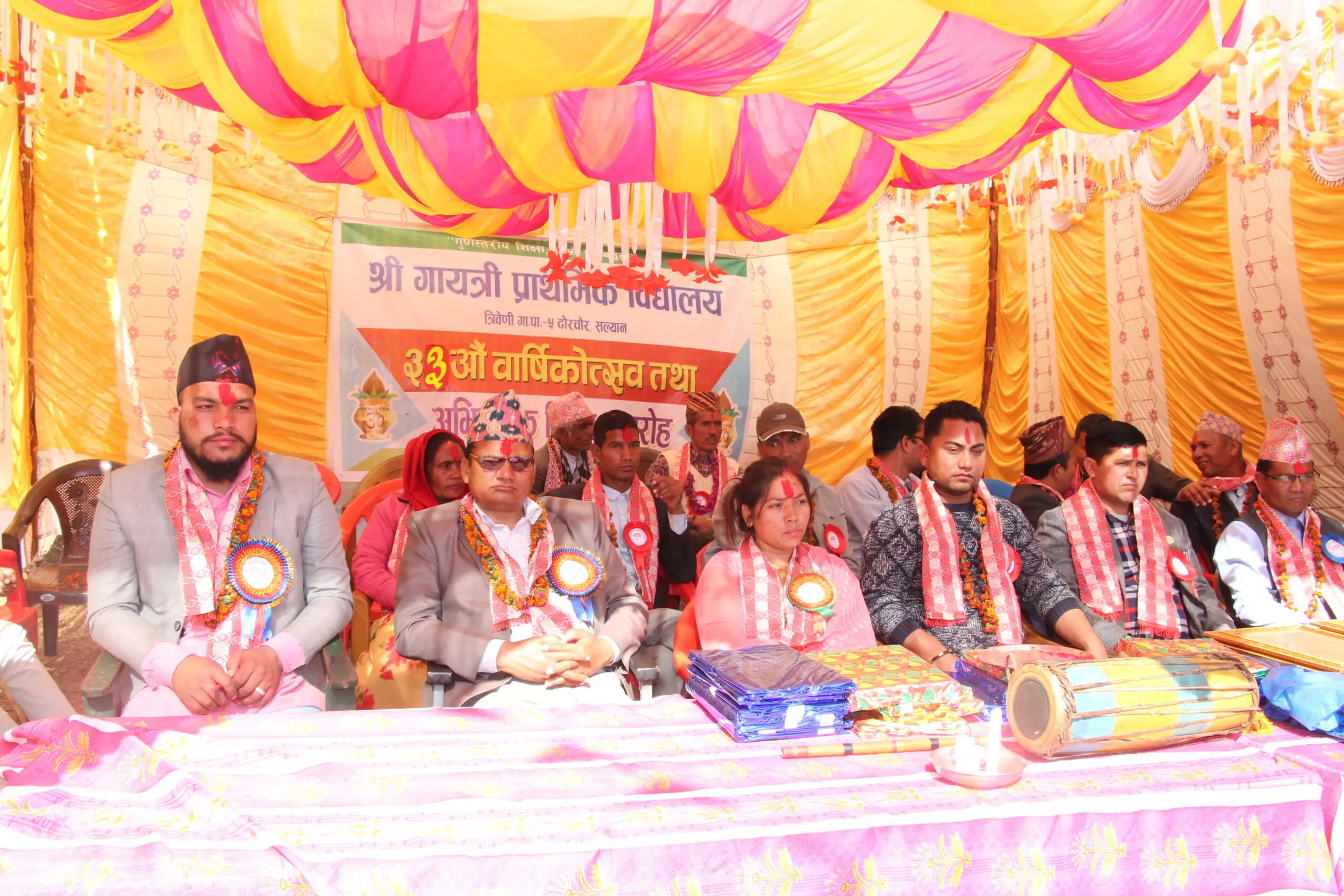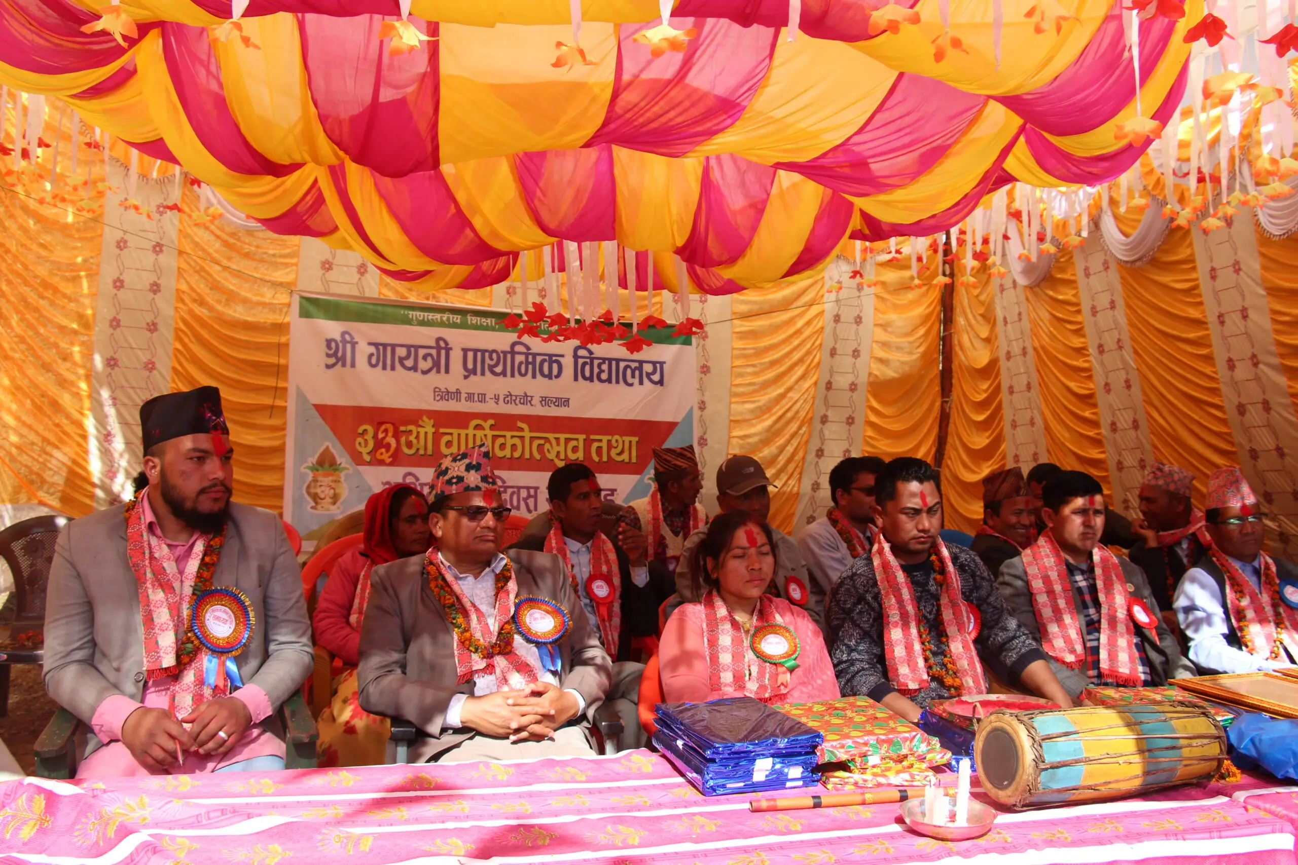 सल्यानको त्रिबेणी गाउँपालिका वडा नं. ५ ढोरचौरमा अबस्थीत गायत्री प्राथामिक बिद्यालयले आफ्नो ३३ औ वार्षिकोत्सब तथा अभिभावक मिलन दिवश भब्य कार्यक्रम गरि मनाएको छ । बिद्यालय ब्यबस्थापन समितिका अध्यक्ष ज्ञान संगम सुनारको अध्यक्षतामा सुरु भएको कार्यक्रमको प्रमुख अतिथि त्रिवेणी गाउँपालिका अध्यक्ष खिम बहादुर रावत, विशिष्ठ अतिथि उपाध्यक्ष सिता खड्का पुन रहनु भएको थियो । वडा नं. ५ का वडाअध्यक्षले वडा नं. ५ बाट २ लाख बजेट बिनियोजन गरेर विद्यालयमा भित्तेलेखनका साथै जिर्ण रहेको शिशु कक्षालाई मर्मत गरिएको बताउनु भयो ।