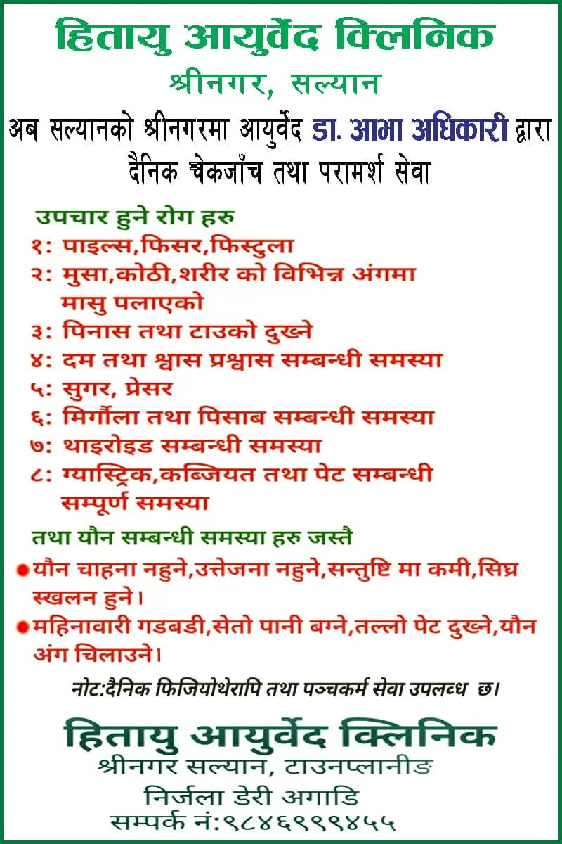 वैकल्पिक चिकित्सा पद्धतीको रूपमा हेरिएको आयुर्वेद उपचारतर्फ बिरामी आकर्षित हुँदै गएका छन् । लामो समयसम्म औषधि सेवन गर्नु पर्ने नसर्ने प्रकृतिको दीर्घ रोगको उपचार आयुर्वेद विधिबाट गर्ने क्रम पनि पछिल्लो समय बढेको छ । जिल्लामै पहिलोपटक आयुर्वेद सम्बन्धि विभिन्न रोगको उपचार गर्न सल्यानको श्रीनगरमा हितायु आयुर्वेद क्लिनिक संचालनमा आएको छ । लामो समयदेखि आयुर्वेदिक क्षेत्रमा काम गरेकी डा. आभा अधिकारीले उक्त क्लिनिक संचालनमा ल्याउनु भएको हो ।